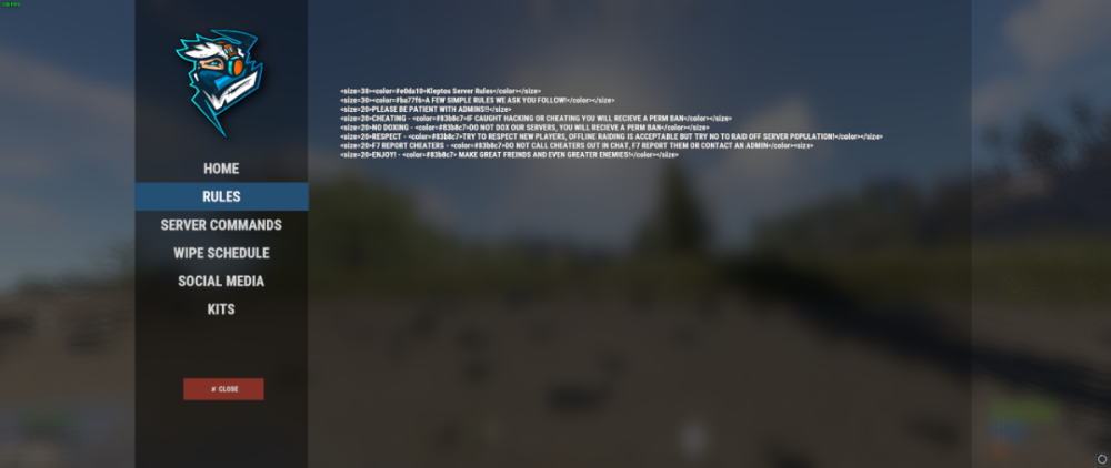 "<size=38><color=#e0da10>Kleptos Server Rules</color></size>",