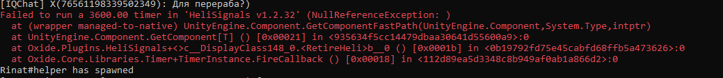 NullReferenceException: Object reference not set to an instance of an object at Oxide.Plugins.HeavyOilRigEvent.DeployHackableCrates () [0x00062] in <11ff248992fe4bc08e96739456be8cb4>:0 at Oxide.Plugins.HeavyOilRigEvent.SetupHeavyOilRig (System.Boolean isManual) [0x000a0] in <11ff248992fe4bc08e96739456be8cb4>:0 at Oxide.Plugins.HeavyOilRigEvent+<RunHeavyOilRigEvent>d__38.MoveNext () [0x000ac] in <11ff248992fe4bc08e96739456be8cb4>:0 at UnityEngine.SetupCoroutine.InvokeMoveNext (System.Collections.IEnumerator enumerator, System.IntPtr returnValueAddress) [0x00026] in <935634f5cc14479dbaa30641d55600a9>:0 UnityEngine.MonoBehaviour:StartCoroutineManaged2(MonoBehaviour, IEnumerator) UnityEngine.MonoBehaviour:StartCoroutine(IEnumerator) Oxide.Plugins.HeavyOilRigEvent:cmdHeavyOilStart(IPlayer, String) Oxide.Plugins.HeavyOilRigEvent:DirectCallHook(String, Object&, Object[]) Oxide.Plugins.CSharpPlugin:InvokeMethod(HookMethod, Object[]) Oxide.Core.Plugins.CSPlugin:OnCallHook(String, Object[]) Oxide.Core.Plugins.Plugin:CallHook(String, Object[]) Oxide.Plugins.<>c__DisplayClass7_0:<HandleAddedToManager>b__0(IPlayer, String, String[]) Oxide.Core.Plugins.Plugin:CovalenceCommandCallback(IPlayer, String, String[]) Oxide.Game.Rust.Libraries.Covalence.<>c__DisplayClass7_0:<RegisterCommand>b__0(Arg) ConsoleSystem:Internal(Arg) ConsoleSystem:Run(Option, String, Object[]) Oxide.Game.Rust.Libraries.Server:Command(String, Object[]) Oxide.Plugins.EventController:CheckEvents() InvokeHandlerBase`1:DoTick() InvokeHandlerBase`1:LateUpdate()