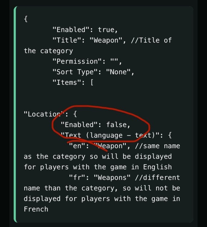 Try this: "Localization": { "Enabled": true, "Text (language - text)": { "en": "Home", "fr": "Domicile" } }