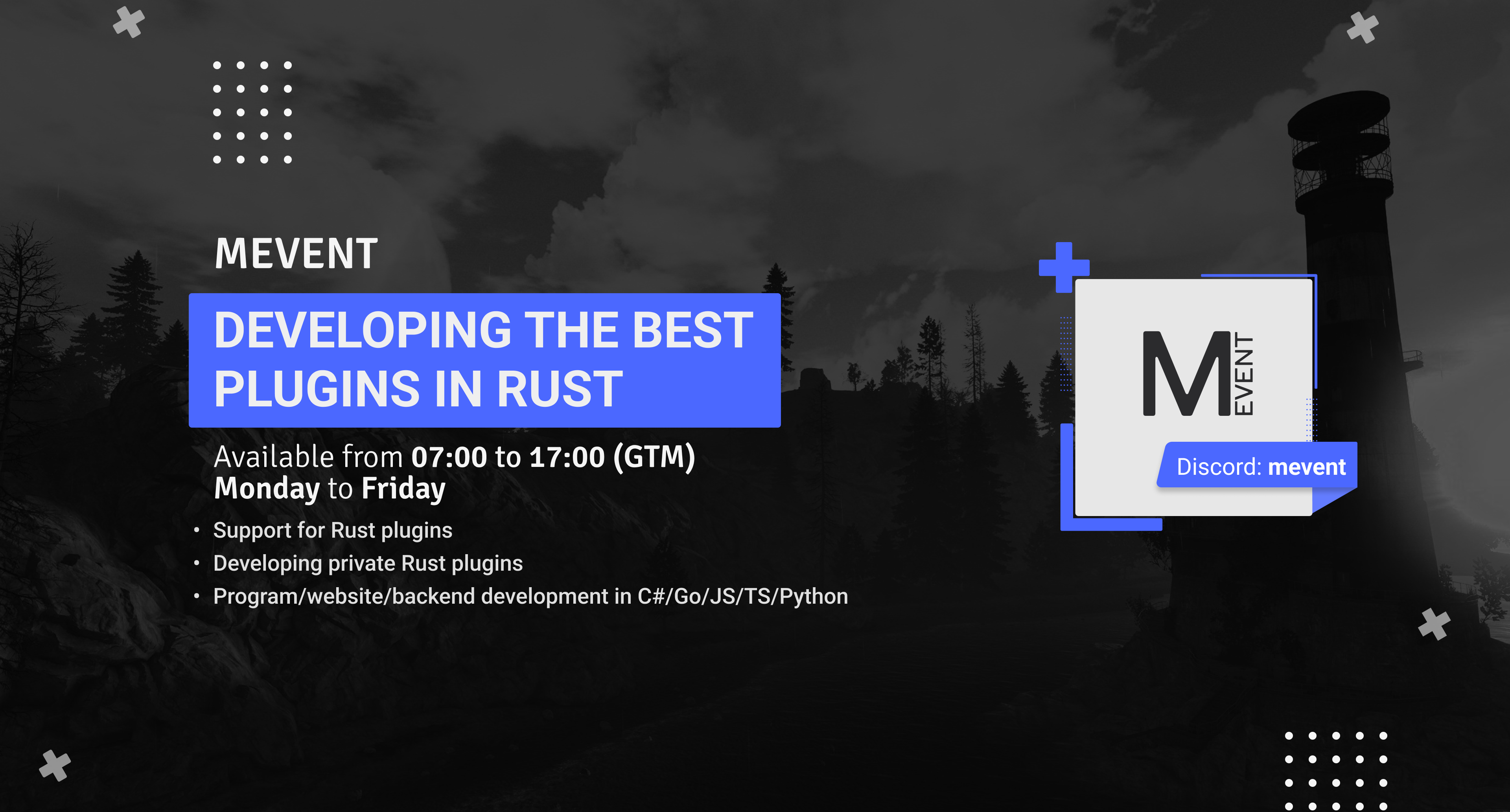 Hi! DM me on Discord: Mevent#4546