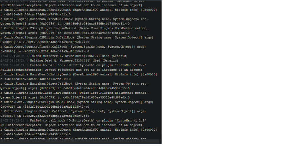 Failed to call hook 'OnEntityDeath' on plugin 'HuntsMan v1.1.1' (NullReferenceException: Object reference not set to an instance of an object) at Oxide.Plugins.HuntsMan.OnEntityDeath (BaseAnimalNPC animal, HitInfo info) [0x0002a] in <4b11e13d1e4846c7af84326477717281>:0 at Oxide.Plugins.HuntsMan.DirectCallHook (System.String name, System.Object& ret, System.Object[] args) [0x001e6] in <4b11e13d1e4846c7af84326477717281>:0 at Oxide.Plugins.CSharpPlugin.InvokeMethod (Oxide.Core.Plugins.HookMethod method, System.Object[] args) [0x00079] in <31122a27a2414cd799150f8677cf39d4>:0 at Oxide.Core.Plugins.CSPlugin.OnCallHook (System.String name, System.Object[] args) [0x000d8] in <c2afd8354b8b4f3ca451cf5a1aa111c3>:0 at Oxide.Core.Plugins.Plugin.CallHook (System.String hook, System.Object[] args) [0x00060] in <c2afd8354b8b4f3ca451cf5a1aa111c3>:0