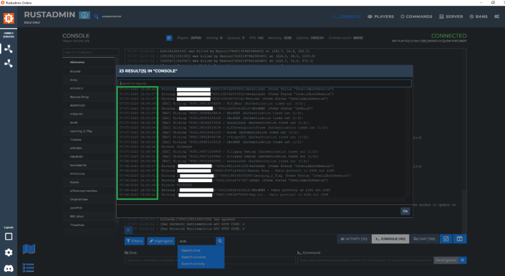 07/03 22:02:47 | Calling 'OnEntityDeath' on 'DeathMessage v1.0.8' took 26737ms 07/03 22:02:47 | Calling 'OnEntityDeath' on 'DeathMessage v1.0.8' took average 0ms 07/03 22:02:47 | TheProcess[76561198136075040] was killed by fall at (-952.8, -24.3, -164.7) 07/03 22:02:47 | 76561198997952120/vzlawaisblack kicked: Packet Flooding: Player Tick 07/03 22:02:47 | 76561198136075040/TheProcess kicked: Packet Flooding: Player Tick 07/03 22:02:47 | 76561198083019995/jorgonlor kicked: Packet Flooding: Player Tick 07/03 22:02:47 | 76561198148289912/Romanu' kicked: Packet Flooding: Player Tick 07/03 22:02:47 | 76561199166094759/novicepower kicked: Packet Flooding: Player Tick 07/03 22:02:47 | 76561198009248978/zapigijon kicked: Packet Flooding: Player Tick 07/03 22:02:47 | 76561199323124855/Stoney kicked: Packet Flooding: Player Tick 07/03 22:02:47 | 76561198215522020/Tejatt1 kicked: Packet Flooding: Player Tick 07/03 22:02:47 | 76561198132037316/Jason kicked: Packet Flooding: Player Tick 07/03 22:02:47 | 76561198805195113/pablorainbowsix kicked: Packet Flooding: Player Tick 07/03 22:02:47 | 76561198245085078/victooor1985 kicked: Packet Flooding: Player Tick