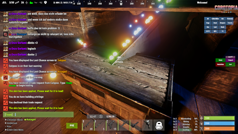 I have in some way the same problem... If i set everything up i give myself a radio and set it up then i give me a secound and i cant change the mhz... and then its bugging... and i get an error from CRadio Sry for bad english xD (16:38:41) | [Oxide] 16:38 [Error] Failed to call hook 'OnServerInitialized' on plugin 'CRadio v1.0.3' (KeyNotFoundException: The given key was not present in the dictionary.) at System.Collections.Generic.Dictionary`2[TKey,TValue].get_Item (TKey key) [0x0001e] in <fb001e01371b4adca20013e0ac763896>:0 at Oxide.Plugins.CRadio.OnPlayerConnected (BasePlayer player) [0x000cf] in <3fefbebd9f774a02ae8595c549e2d5c3>:0 at Oxide.Plugins.CRadio.OnServerInitialized () [0x0011a] in <3fefbebd9f774a02ae8595c549e2d5c3>:0 at Oxide.Plugins.CRadio.DirectCallHook (System.String name, System.Object& ret, System.Object[] args) [0x0008d] in <3fefbebd9f774a02ae8595c549e2d5c3>:0 at Oxide.Plugins.CSharpPlugin.InvokeMethod (Oxide.Core.Plugins.HookMethod method, System.Object[] args) [0x00079] in <3606d2af539c45e4b5c61658e6a8b307>:0 at Oxide.Core.Plugins.CSPlugin.OnCallHook (System.String name, System.Object[] args) [0x000d8] in <c2afd8354b8b4f3ca451cf5a1aa111c3>:0 at Oxide.Core.Plugins.Plugin.CallHook (System.String hook, System.Object[] args) [0x00060] in <c2afd8354b8b4f3ca451cf5a1aa111c3>:0 Edit: I dont know how but it works now... ???