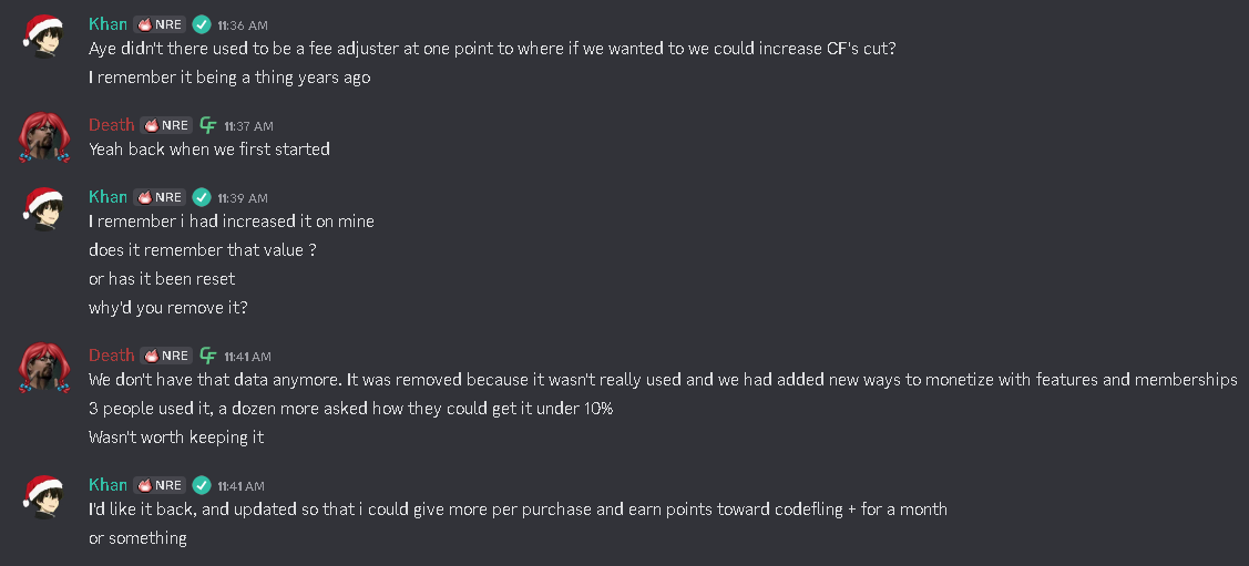 I want to bring back the ability to increase codefling's cut per purchase again, and have the ability to earn points towards rewards like a free month of codefling+/pros subs. Or to feature a file, etc