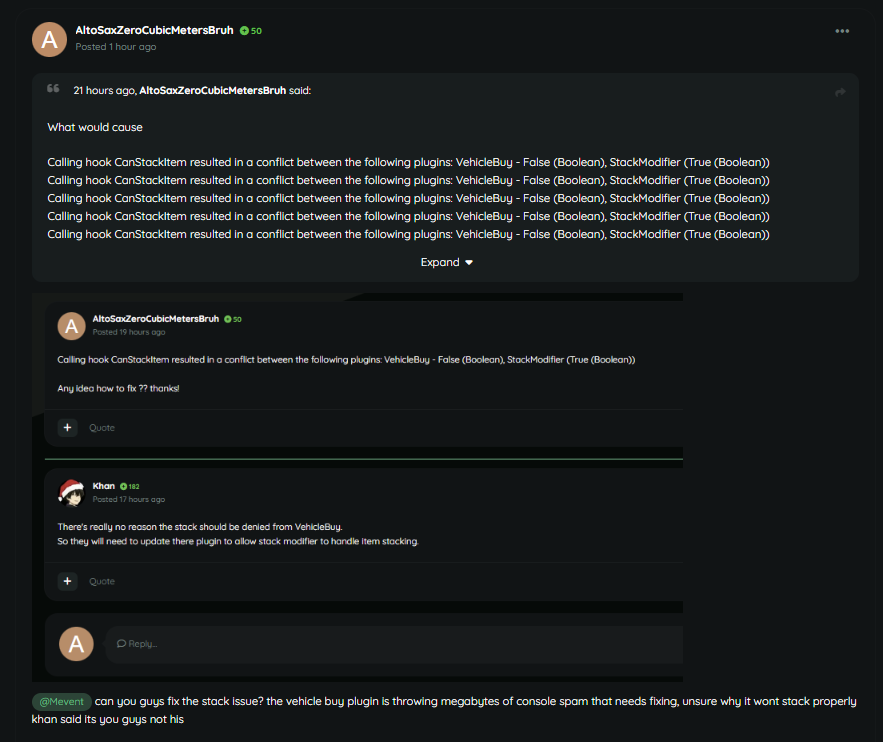 2. Calling hook CanStackItem resulted in a conflict between the following plugins: VehicleBuy - False (Boolean), StackModifier (True (Boolean)) Any idea how to fix ?? thanks!