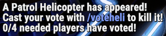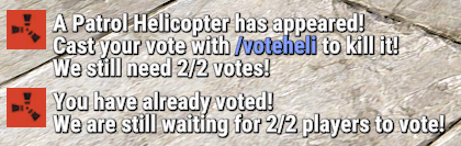 Some initial findings: Shows both toasts and chat messages, even when toasts are disabled. Shows "We still need 0/1 votes!" when a single player is online, and they haven't voted (seems like it should say "still need 1/1 votes" or "have 0 of 1 needed votes"). Shows "1 Patrol Helis have been KILLED!!" twice in a row in chat on vote.