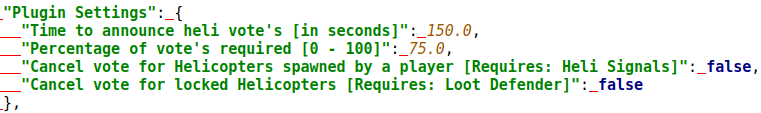 First, something is off with the vote count...the "still needed" number seems to go up instead of down as more people vote. Second, while the plugin saves off the list of voters, it doesn't re-add them to `votingProperties.votes` if the plugin gets reloaded. If it helps, here is my config: { "Settings": { "Time to announce heli vote's [in seconds]": 300, "Percentage of vote's required [0 - 100]": 80.0, "Cancel vote for Helicopters spawned by a player [Requires: Heli Signals]": false, "Cancel vote for locked Helicopters [Requires: Loot Defender]": false }, "Commands & Permissions": { "Heli vote Command": "voteheli", "Heli kill command [Requires admin perm]": "killhelis", "Voting Permission": "use", "Admin Permission": "admin" }, "Messages": { "Use Chat Messages?": true, "Use chat for Server Messages?": true, "Use Toastify Messages?": false, "Use Toastify for Server Messages?": false, "Use Notify Messages?": false, "Use Notify for Server Messages?": false, "Steam ID to use for the image for messages? [0 = default]": 0 }, "Notifications": { "Toastify Positive Msg ID": "success", "Toastify Negative Msg ID": "error", "Toastify Msg Duration": 10.0, "Notify Positive Msg ID": 0, "Notify Negative Msg ID": 1 }, "Version": { "Major": 1, "Minor": 2, "Patch": 4 } }