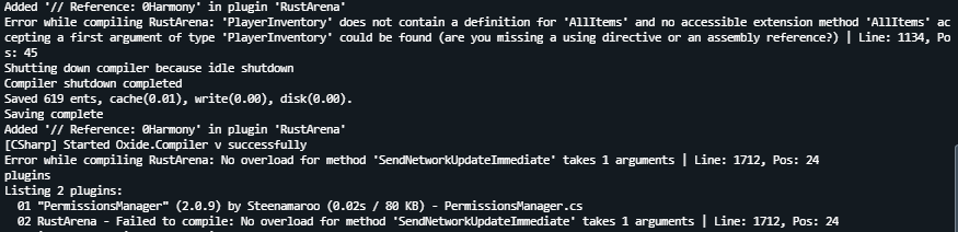 02 RustArena - Failed to compile: No overload for method 'SendNetworkUpdateImmediate' takes 1 arguments | Line: 1712, Pos: 24