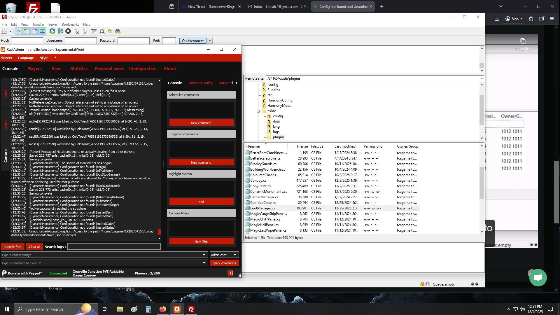 2. I'm uploading a screenshot of my RCON Console and FileZilla. You will notice that I have Convoy and it is Running fine and that the required permissions are set for LootManager but yet it is still not finding the Configurations for DynamicMonument and not writing the save file.