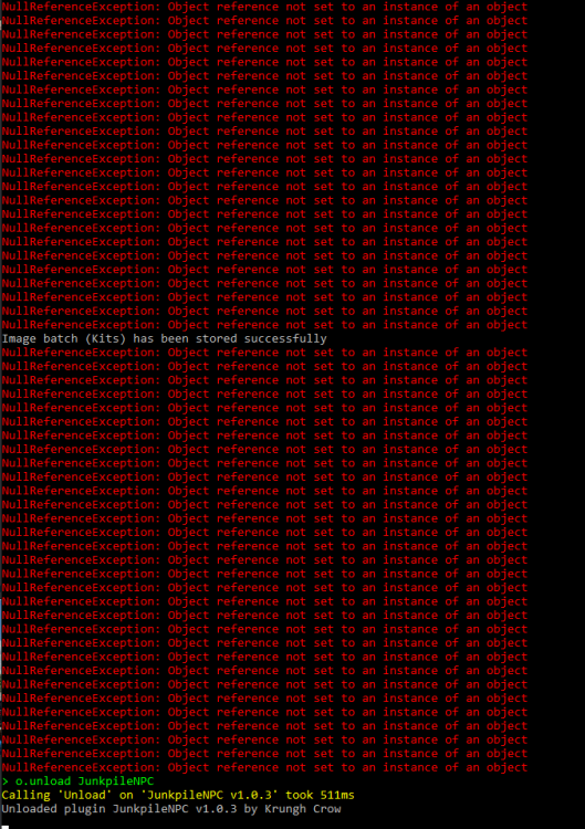 Yeaha well using: BotReSpawn ZombieHorde NightZombies WalkingDead but dont have any problems if i start the Testserver without this Plugin. Errors startet since i installed JunkpileNPC Ill try and start the server without the NPC plugins and start with only one at a time to recheck.... Will give you a feedback later. Thanks for your fast reply