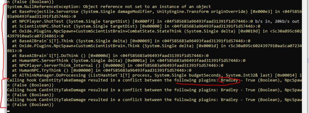 Hi, I'm getting the attached errors. Bow bots won't use the bow even with arrows, they just look at you. I saw this plugin on another server and the bots were kinda slow at attacking, would take a second to take aim and fire, but these seem instant and not sure where to lower their response time. There also seems to be a conflict with the Bradley plugin (spawns bradleys at all monuments). I've set the code " "Can_Kill_NPC": true" to both true and false to test, same boolean error though