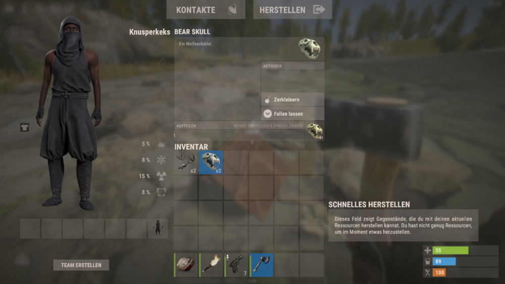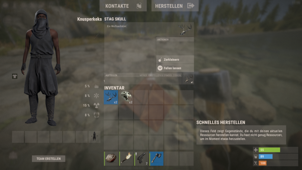 Hi everyone, I found a bug in the stable version. line 859 CraftMenu.cs bps["multiplegrenadelauncher"].Resources.Add("pipes", 6); needs to be changed to bps["multiplegrenadelauncher"].Resources.Add("metalpipe", 6);