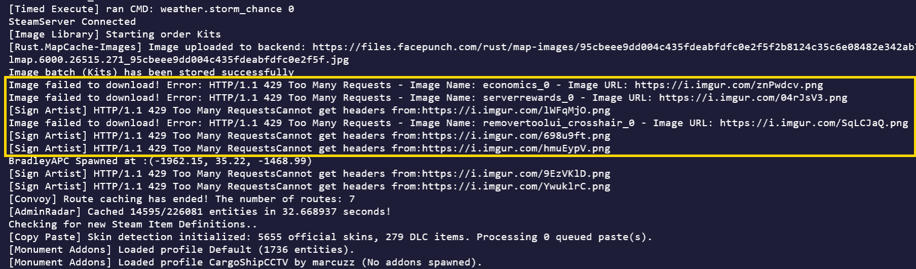 When I cip a Steam collection that doesn't have any approved skins in it, it works fine after reloading the plugin or restarting the server. But if I try to add individual skins with sip, the plugin freaks out and reinstalls the default config file, thus erasing my entire config. I have had this happen 3 times so far, and I am not about to test it again. Knowing that collections seem to be ok, I made a Steam collection in the workshop and added skins into it and added it to the config. I can verify it is indeed in the config, but not a single skin from it is loading in. Is there something I am missing? And I do not have an Oxide account, but I wanted to also let you know Sign Artist is broken. I have tried version 1.4.1 and the newest, 1.4.4, and tried images from both imgur and dropbox. I have checked the server host and am trying to contact Imgur for clarification, but I noticed both Sign Artist and Image Library seem to be having issues that throw "429 Too Many requests" errors. Dropbox loads the signs, but it's just the white box with red question mark that pops in. I was using the monument addons plugin and tried both png's and jpg's. I know you have been a busy mofo the last couple wipes, thanks for your hard work.