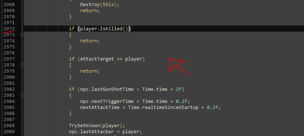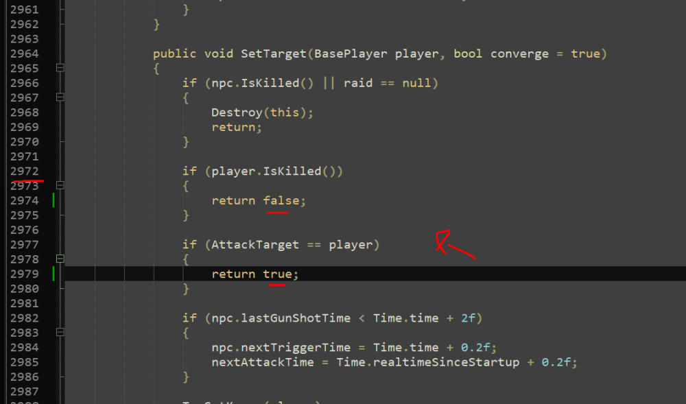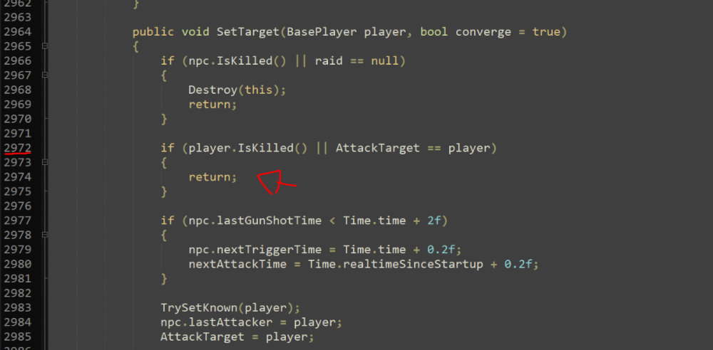 Yes I have tried doing that but the "true" and "false" aren't there after "return" if I try to add them it fails to compile. (sorry don't have the best background) I added the code you posted in your reply above but without the true and false it compiled but NPC's still don't shoot out of dome only roof campers. Apolgies if I am doing something wrong, could you tell me what I should be doing instead? I referenced images of how it looks below. As usual Thank you Nivex. (The Error I get if I paste it exactly how you wrote it "Error while compiling RaidableBases: Since 'RaidableBases.HumanoidBrain.SetTarget(BasePlayer, bool)' returns void, a return keyword must not be followed by an object expression | Line: 2976, Pos: 21")