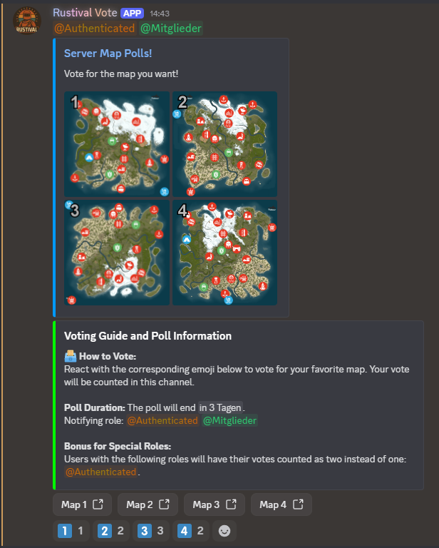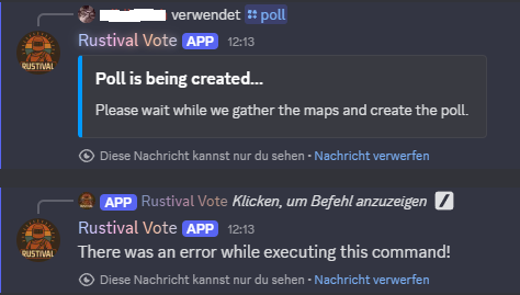 Hi, the Bot is showing up in Discord, but hangs with an Error till disconnect. Node output: === Drxps Rust Maps Poll Bot === Thank you for your purchase! Bot has started and is online now. If you need any support, visit our Discord: https://discord.gg/GG2Vdvkhvg Made by Drxp. Enjoy the bot! Registering guild commands for RUSTIVAL - PVE|PVP|Events. (node:4284) DeprecationWarning: The ready event has been renamed to clientReady to distinguish it from the gateway READY event and will only emit under that name in v15. Please use clientReady instead. (Use `node --trace-deprecation ...` to show where the warning was created) 2 commands registered to guild: RUSTIVAL - PVE|PVP|Events (node:4284) Warning: Supplying "ephemeral" for interaction response options is deprecated. Utilize flags instead. Error: Invalid duration unit. Use m (minutes), h (hours), or d (days). at calculatePollEndTime (C:\RustMaps\commands\poll.js:383:19) at Object.execute (C:\RustMaps\commands\poll.js:84:29) at process.processTicksAndRejections (node:internal/process/task_queues:95:5) at async Object.execute (C:\RustMaps\events\interactionCreate.js:15:17) Error processing map IDs: CombinedError (2) Received one or more errors 1 ValidationError > s.nullish() | Expected undefined or null | | Received: | | '' 2 ExpectedConstraintError > s.string().url() | Invalid URL | | Expected: expected to match a URL | | Received: | | '' at _UnionValidator.handle (C:\RustMaps\node_modules\@sapphire\shapeshift\dist\cjs\index.cjs:1965:23) at _UnionValidator.parse (C:\RustMaps\node_modules\@sapphire\shapeshift\dist\cjs\index.cjs:972:90) at EmbedBuilder.setURL (C:\RustMaps\node_modules\@discordjs\builders\dist\index.js:389:18) at Object.execute (C:\RustMaps\commands\poll.js:129:26) at process.processTicksAndRejections (node:internal/process/task_queues:95:5) at async Object.execute (C:\RustMaps\events\interactionCreate.js:15:17) Bot config.json: { "token": "MY_TOKEN", "guildId": "MY_GID", "clientId": "", "websiteUrl": "", "poll_channel_id": "MY_CHANNELID", "e_img_Title": "Server Map Polls!", "e_img_Description": "Vote for the map you want!", "rustmapsapi_key": "MY_RUSTAPIKEY", "extraEntryFeature": { "_note_from_dev (READ)": "This feature allows you to give certain roles, such as VIPs, additional voting power during polls. When enabled, users with the specified roles will have their votes count as two instead of one. You can add the role IDs in the 'roleIds' array, and users with any of these roles will receive the extra vote benefit. Set 'enabled' to true to activate the feature.", "enabled": false, "roleIds": ["ROLE_ID", "ROLE_ID"] }, "_poll_channel_info": "The poll_channel_id is used as the default channel for polls when no specific channel is specified in the /poll command. Users can now specify a different channel using the 'channel' option in the /poll command." } Any ideas? Regards
