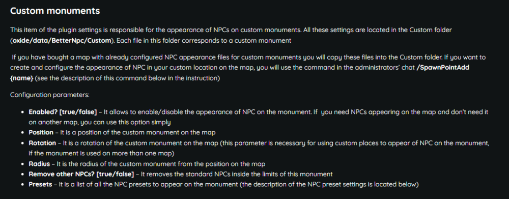 Hi, to identify any npc from the NpcSpawn plugin, it is enough to check for skinID == 11162132011012, then it is best to use the name of the NPC (displayName) to indicate which NPC needs to be given how many points. This applies to all NPCs except bosses. As for the bosses, there is a Hook (void OnBossKilled(ScientistNPC boss, BasePlayer attacker)), when they kill the boss, which is perfect, which boss was killed can be identified by displayName, each boss has its own individual name