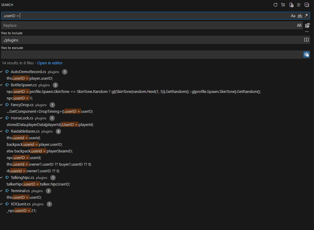 If I am understanding that correctly you are saying that any plugin spawning NPCs that utilizes userID could make any other plugin spawning NPCs, regardless of userID use, become invisible? That's a pretty shitty situation to pass off to both devs and admins from the framework side - has this not been a consideration to solve for broadly? I mean even an oxide debug warning that calls out userID collisions sounds like an appropriate thing for something so impactful. I did a quick search on my December backup plugins folder: Based on what you described, it looks like maybe XDQuest or TalkingNpcs could be the offenders? I see XDQuest it is making a hardcoded ID for the questgiver NPC. To compound that issue a bit, I do reload the plugin every hour to ensure the building gets pasted correctly, so I could see how that might cause conflicts randomly. I have quite a few TalkingNpc NPCs as well, and those are basically hardcoded IDs in practice - so I could see how that might also affect it. However, both of those plugins have been running un-altered for quite some time... is this userID logic something FP introduced specifically in November?