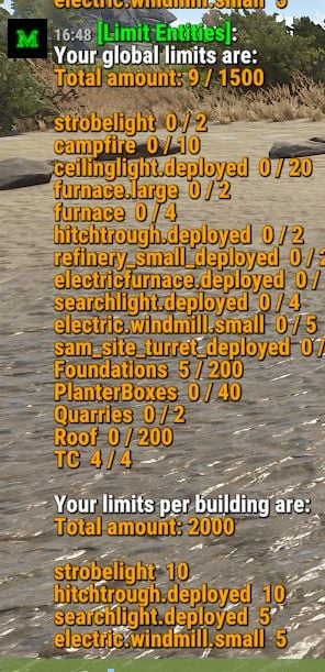 While NRE is fixed, there is still an issue with some prefabs can be broken after this wipe/ update. You will get something like [Limit Entities] You have 11 untracked prefabs in your config file! To get a list of all supported prefabs use console command limitentities.list assets/content/props/strobe light/strobelight.prefab assets/prefabs/deployable/hitch & trough/hitchtrough.deployed.prefab assets/prefabs/deployable/search light/searchlight.deployed.prefab assets/prefabs/deployable/windmill/electric.windmill.small.prefab assets/prefabs/deployable/campfire/campfire.prefab assets/prefabs/deployable/ceiling light/ceilinglight.deployed.prefab assets/prefabs/deployable/furnace.large/furnace.large.prefab assets/prefabs/deployable/furnace/furnace.prefab assets/prefabs/deployable/oil refinery/refinery_small_deployed.prefab assets/prefabs/deployable/playerioents/electricfurnace/electricfurnace.deployed.prefab assets/prefabs/npc/sam_site_turret/sam_site_turret_deployed.prefab This is not related to the plugin. I'm not sure what the problem is exactly, as I see it on one server and not on another. I need more time to investigate further.