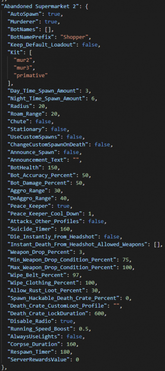 I've run into an issue I'm not sure how to resolve, or at least I'd like to report this and see if we can get to the bottom of it. So the way I have the config set up is essentially dividing small and large monuments, with the amounts and types that spawn. Specifically for "Abandoned Supermarket 2", I have it identical to "Abandoned Supermarket 0", with the exception of murderers using different kits. I have it set up to spawn 3 murderers during the day, and 2 at night. I wasn't sure if it was 3+2 for night time, or just 2... I was still kind of experimenting...