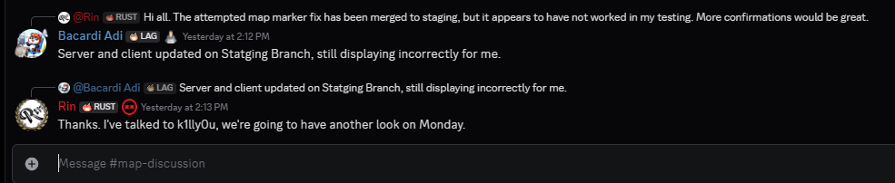 Hi, fixed everything except the bears not spawning - I see the bear prefab I used no longer works, I also just tested the new AI bear spawner that facepunch made for mappers and that doesn't work either, so I'll see if I can use betternpc to spawn them. The patch will be uploaded tommorow