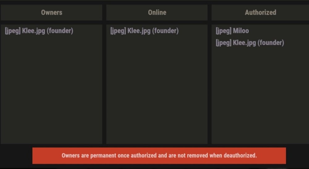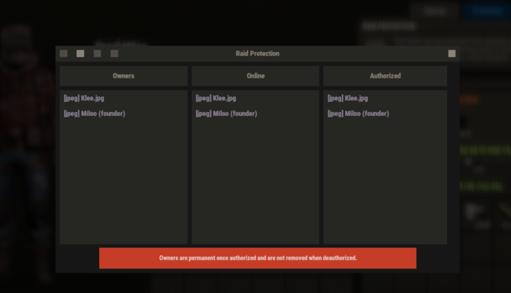 23. It seems there is an issue where players that later, after the cupboard has been placed by the founder, join the same clan and automatically authorize via Clans Reborn and Dynamic Cupshare, are not being registered in the Raid Protection as owner. Therefore the hourly owner costs are wrong. You see this in the first 2 pics here. The last 2 pics show another cupboard placed by the second player when he already was part of the clan. Here both players are registered in the Raid Protection correctly. Update: Also, it happened that owners just randomly disappeared and later came back.