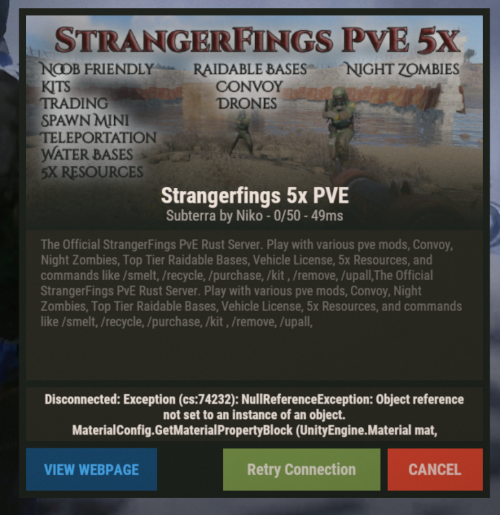50.81.222.168:50629/76561199043228255/mrclip disconnecting: Exception (cs:73433): NullReferenceException: Object reference not set to an instance of an object. MaterialConfig.GetMaterialPropertyBlock (UnityEngine.Material mat, UnityEngine.Vector3 pos, UnityEngine.Vector3 scale) (at <00000000000000000000000000000000>:0) MaterialSetup.Setup () (at <00000000000000000000000000000000>:0) GameManager.CreatePrefab (System.String strPrefab, UnityEngine.Vector3 pos, UnityEngine.Quaternion rot, UnityEngine.Vector3 scale, System.Boolean active) (at <00000000000000000000000000000000>:0) Prefab.Spawn (UnityEngine.Vector3 pos, UnityEngine.Quaternion rot, UnityEngine.Vector3 scale, System.Boolean active) (at <00000000000000000000000000000000>:0) World.Spawn (System.String category, Prefab prefab, UnityEngine.Vector3 position, UnityEngine.Quaternion rotation, UnityEngine.Vector3 scale) (at <00000000000000000000000000000000>:0) World.Spawn (ProtoBuf.PrefabData prefab) (at <00000000000000000000000000000000>:0) World+<Spawn>d69.MoveNext () (at <00000000000000000000000000000000>:0) WorldSetup+<InitCoroutine>d15.MoveNext () (at <00000000000000000000000000000000>:0) UnityEngine.SetupCoroutine.InvokeMoveNext (System.Collections.IEnumerator enumerator, System.IntPtr returnValueAddress) (at <00000000000000000000000000000000>:0) GameManager:CreatePrefab(String, Vector3, Quaternion, Vector3, Boolean) Prefab:Spawn(Vector3, Quaternion, Vector3, Boolean) World:Spawn(String, Prefab, Vector3, Quaternion, Vector3) World:Spawn(PrefabData) <Spawn>d69:MoveNext() <InitCoroutine>d__15:MoveNext() UnityEngine.SetupCoroutine:InvokeMoveNext(IEnumerator, IntPtr)
