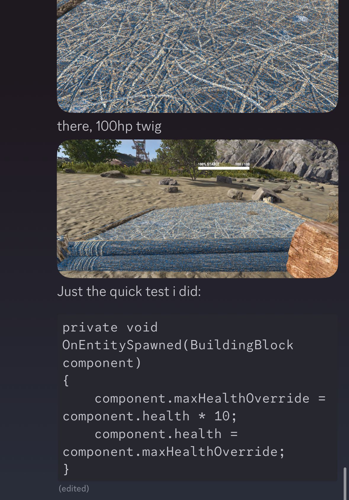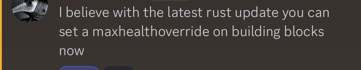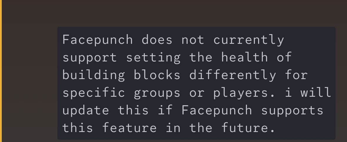 Hello before you told me if anything changed you could add this feature. It looks like Facepunch changed some things. Would it please be possible to add a Default Group and a VIP Group so default players would get normal foundation/wall health and the VIP group could get 2x Health foundations/walls? -