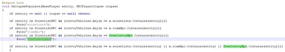 in here void OnCorpsePopulate(BasePlayer entity, NPCPlayerCorpse corpse) this condition is not met, and so not placing correct loot if (entity is ScientistNPC && (convoyVehicles.Any(x => x.scientists.Contains(entity) || x.roamNpc.Contains(entity) || freeConvoyNpc.Contains(entity)))) i can use a Puts("here"); underneath it, and it does not show unless i kill the vehicle the npc came from