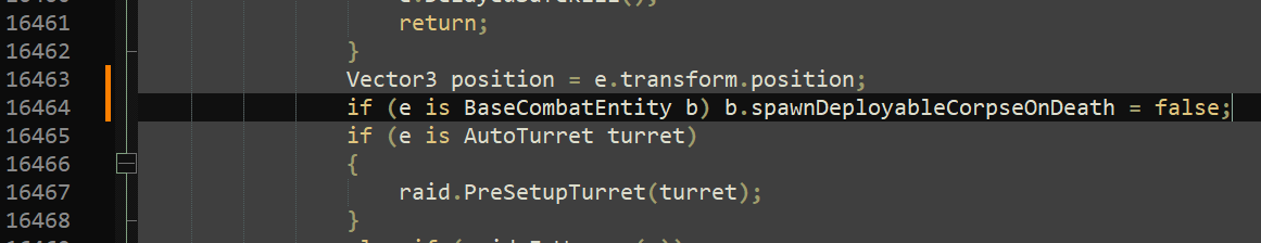 hi, wait for an update or add the fix now if you don't want to wait. if (e is BaseCombatEntity b) b.spawnDeployableCorpseOnDeath = false; online 16463, make a new line and insert that code on it. it will look like this. -