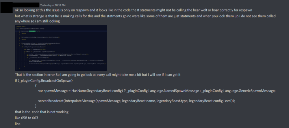 This is the same issue from previous versions. I think its only on re spawn as the inital set of spawning (on server load) seems fine with no errors but as players kill the NPCs I get this in console: 06/03 17:06:01 | Failed to call hook 'OnEntitySpawned' on plugin 'LegendaryBeasts v1.1.3' (NullReferenceException: Object reference not set to an instance of an object) at Oxide.Plugins.LegendaryBeasts.CreateLegendaryBeast (BaseEntity entity, Oxide.Plugins.LegendaryBeasts+LegendaryBeastConfig selectedLegendaryBeastConfig) [0x0013a] in <eb0a11c3491f499d856642af4c589f1b>:0 at Oxide.Plugins.LegendaryBeasts.OnEntitySpawned (BaseNetworkable entity) [0x000a1] in <eb0a11c3491f499d856642af4c589f1b>:0 at Oxide.Plugins.LegendaryBeasts.DirectCallHook (System.String name, System.Object& ret, System.Object[] args) [0x009f5] in <eb0a11c3491f499d856642af4c589f1b>:0 at Oxide.Plugins.CSharpPlugin.InvokeMethod (Oxide.Core.Plugins.HookMethod method, System.Object[] args) [0x00079] in <e23ba2c0f246426296d81c842cbda3af>:0 at Oxide.Core.Plugins.CSPlugin.OnCallHook (System.String name, System.Object[] args) [0x000d8] in <46ff2b534abb4b35952608167523b7ec>:0 at Oxide.Core.Plugins.Plugin.CallHook (System.String hook, System.Object[] args) [0x00060] in <46ff2b534abb4b35952608167523b7ec>:0