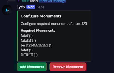/server manage - Manage server settings. For required monuments use RustMaps monument names (Airfield etc)