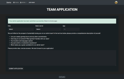 - Form includes fields for role, server, age, gaming hours, server experience, location, languages, admin experience, and suitability for the role.