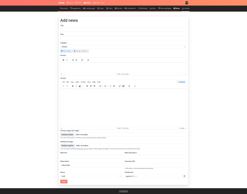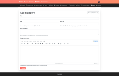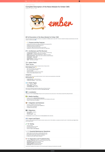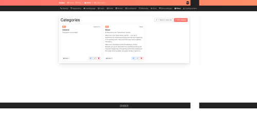News is a production-ready content module for Ember CMS: category SEO, RSS + sitemap automation, gallery uploads, TinyMCE experience, and a homepage widget included by default.