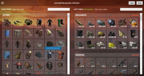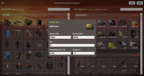 - Edit loot table item Amount Min/Max and Skin id using mouse left click, change amounts, then click anywhere outside the modal to collapse