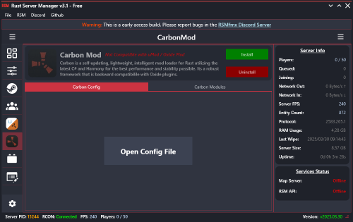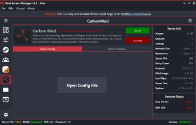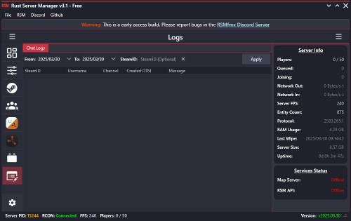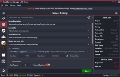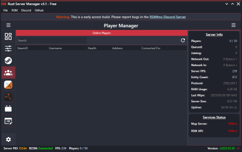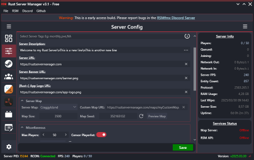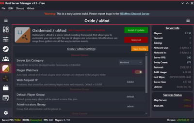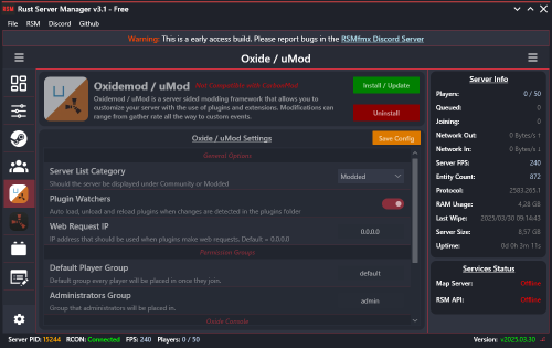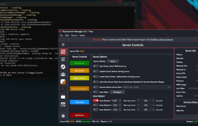 Rust Server Manager (RMSfmx) is a tool that allows you to create and manage dedicated Rust servers. RSMfmx was a paid tool that has recently become free and open source.