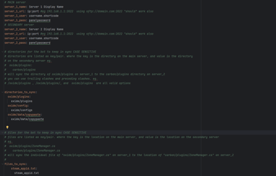 # MAIN server server_1_name: Server 1 Display Name server_1_url: ip:port # eg 192.168.1.1:2022 using sftp://domain.com:2022 "should" work also server_1_user: username.shortcode server_1_pass: panelpassword server_1_sftp: True # do not change, for future functionality # SECONDARY server server_2_name: Server 2 Display Name server_2_url: ip:port # eg 192.168.1.1:2022 using sftp://domain.com:2022 "should" work also server_2_user: username.shortcode server_2_pass: panelpassword server_2_sftp: True # do not change, for future functionality delete_missing_remote: True # set to True or False. if it is missing, it defaults to True for backwards compatability # directories for the bot to keep in sync CASE SENSITIVE # directories are listed as key/pair. where the key is the directory on the main server, and value is the directory # on the secondary server eg. # oxide/plugins: carbon/plugins # # will sync the directory of oxide/plugins on server_1 to the carbon/plugins directory on server_2 # you can use trailing slashes and preceding slashes. eg. # /oxide/plugins , /oxide/plugins/, and oxide/plugins are all valid options # CASE SENSITIVE directories_to_sync: oxide/plugins: oxide/plugins oxide/config: oxide/configs oxide/data/copypaste: oxide/data/copypaste # files for the bot to keep in sync CASE SENSITIVE # files are listed as key/pair. where the key is the location on the main server, and value is the location on the secondary server # eg. # oxide/plugins/ZoneManager.cs carbon/plugins/ZoneManager.cs # # will sync the individual file of "oxide/plugins/ZoneManager.cs" on server_1 to the location of "carbon/plugins/ZoneManager.cs" on server_2 # CASE SENSITIVE files_to_sync: steam_appid.txt: steam_appid.txt # directories for the sync bot to ignore, it will ignore these directories if the path is found within the sync, eg, if you are syncing carbon/data, it will # ignore the following # - carbon/data/AdminMenu # CASE SENSITIVE directories_to_ignore: - carbon/data/AdminMenu - carbon/data/Shop - carbon/data/Backpacks # files for the sync bot to ignore, it will ignore these files if the path is found within the sync, eg, if you are syncing carbon/config, it will # ignore the following # - carbon/configs/AbandonedBases.json # CASE SENSITIVE files_to_ignore: - carbon/configs/AbandonedBases.json - carbon/configs/RaidableBases.json