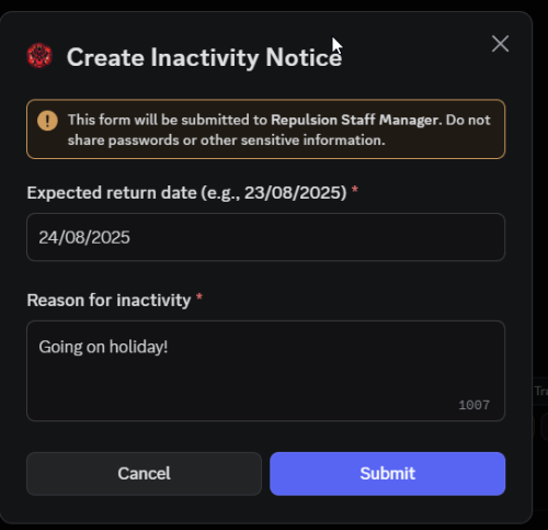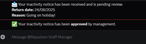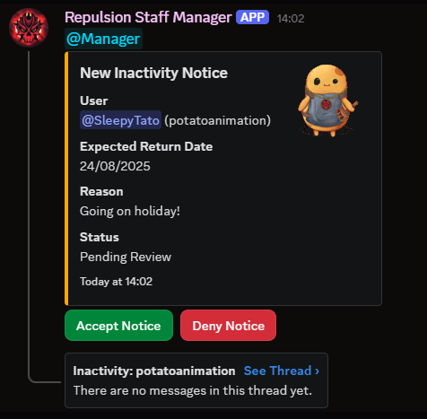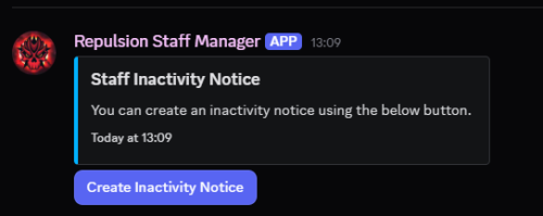 - Create staff inactivity notices with a inactivity-notice command, and allow managers to review these notices and approve/deny them.