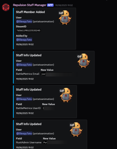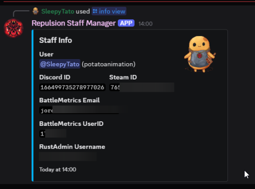 - Set your staff information ( battlemetrics email/username, and rustadmin details (optional) ) via a "/info set" command.