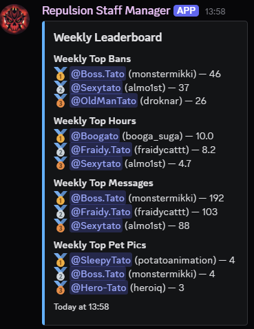 - Weekly & Monthly leaderboards automatically posted showing the top 3 users for that time period for each statistic