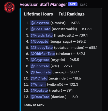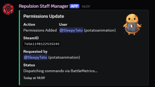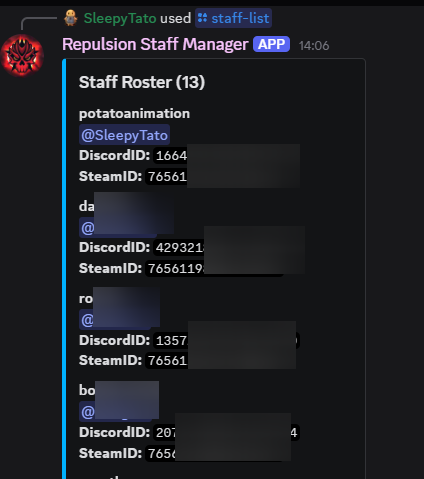 Staff Discord Manager Bot - Use Discord to manage your staff team, set their ingame permissions, create inactivity notices, and track their statistics with leaderboards. As used at Repulsion