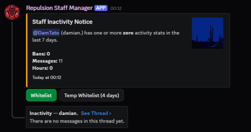 - Inactivity notices for staff who have 0 hours, 0 discord messages or 0 bans in the past 7 days.