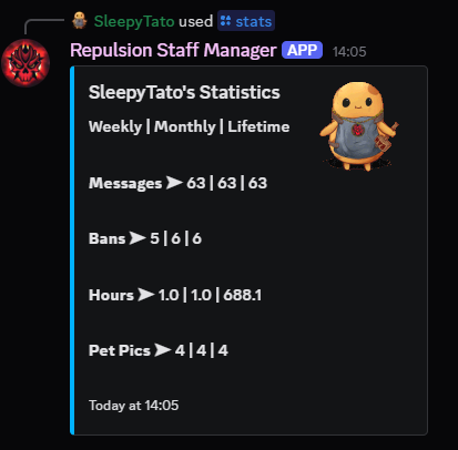 - Check your own statistics (bans, messages, in-game hours & pet pictures sent) via a "/stats" command. Managers can view anyone's stats with "/stats (user)"